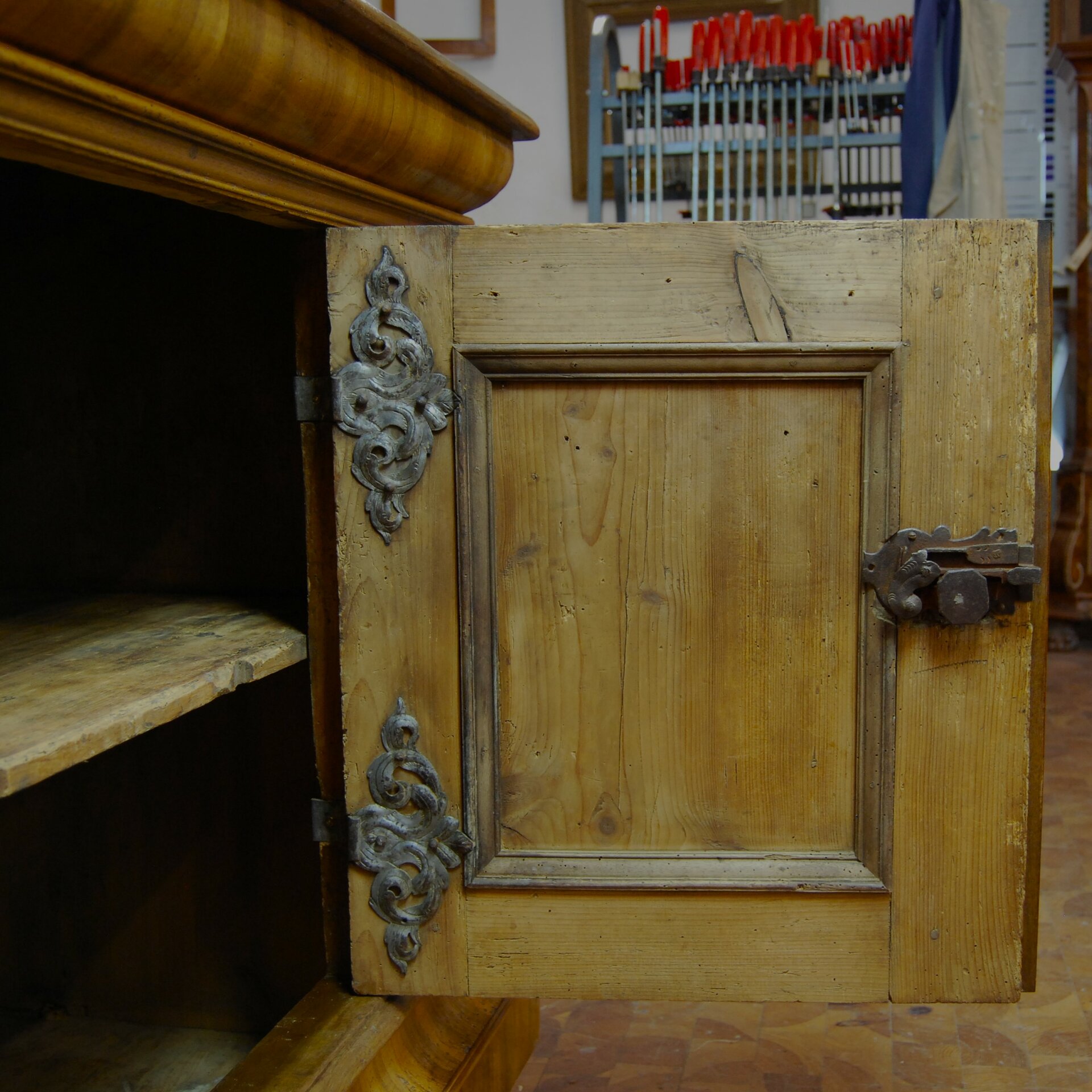 Ergänzt wurde die unterste Furnierung im Sockel und die gedrückten Kugelfüße sowie verschiedene Profilleisten. Die originalen Schlösser und Schlüsselschilder waren leider nicht mehr vorhanden. Sie konnten aber adäquat ergänzt werden.
