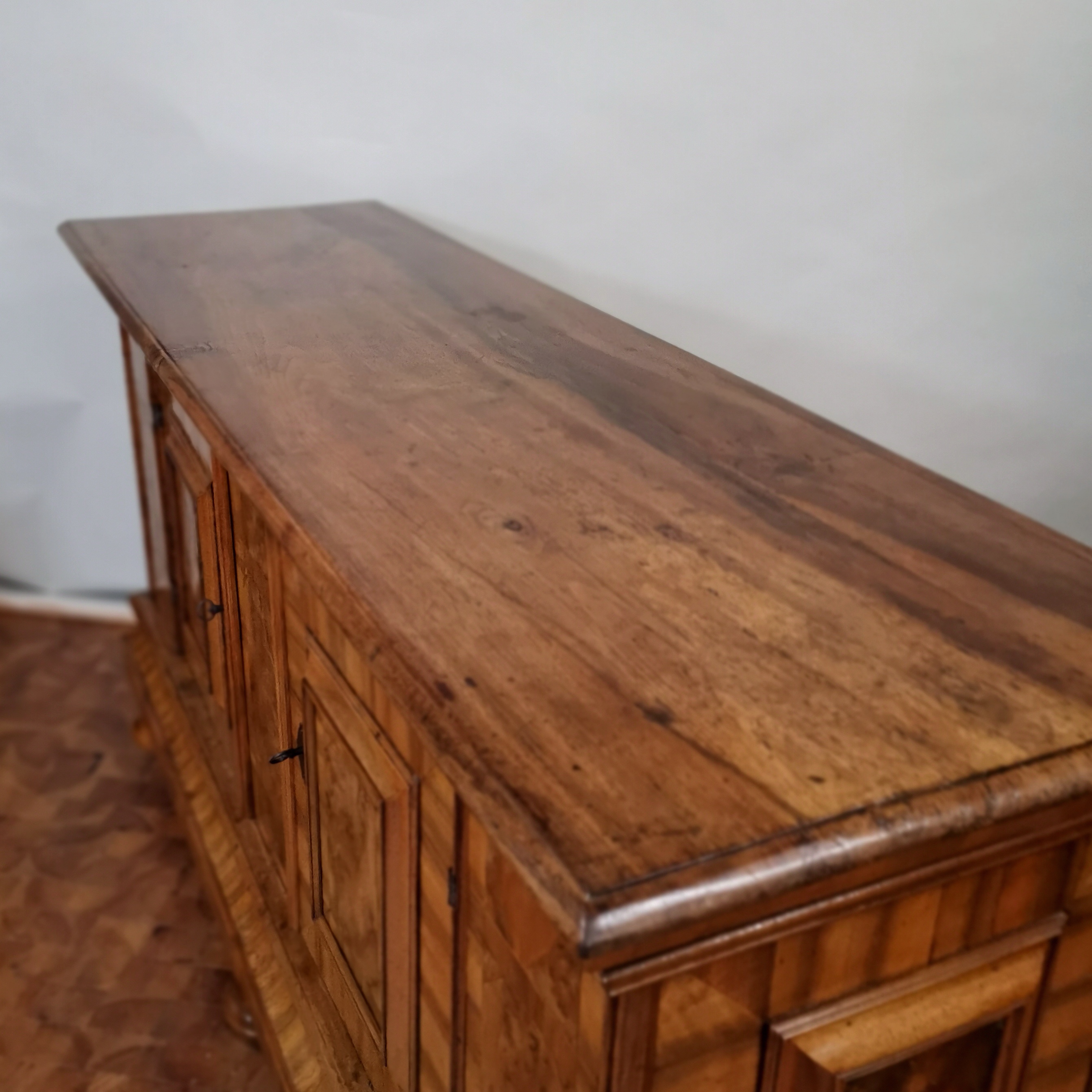 Aus der Bodenseeregion stammt diese Kredenz, die ehemals wohl noch einen Aufsatz hatte. Es läßt sich nur vermuten, dass es sich um ein Kloster- oder Schlossmöbel handelte. Ich tendiere zum Klostermöbel, da im Zuge der Säkularisierung viele Klöster aufgelöst und die Möbel verkauft wurden. Signifikante Ähnlichkeiten mit Kirchenausstattungen des Barocks, die ich schon bearbeitet habe, stützen diese These.